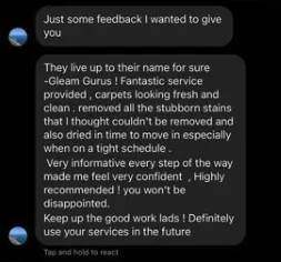 "Highly recommend. This.is.a.really profesional company with a personal.touch and flexibility. Excellent communication from.start to.finish. fantastic job done at a very reasonable cost. All.carpets through the house came up lovely and My hall.which was heavily stained had all marks were removed. Very happy. Thank.you."